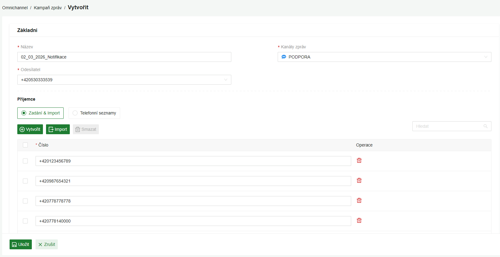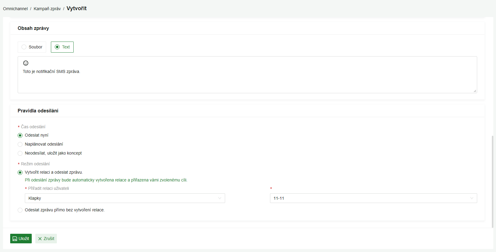 Vytvořit relaci a odeslat zprávu – po odeslání se automaticky vytvoří skupina kampaně a přiřazený operátor/skupina. Pokud příjemce odpoví, SMS bude směrována na vybraného operátora/skupinu.