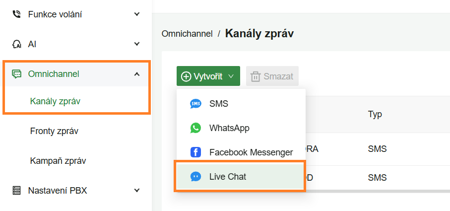 V administrátorském portálu ústředny přejděte do sekce Omnichannel > Kanály zpráv. Klikněte na tlačítko Vytvořit a z nabídky vyberte možnost Live Chat.