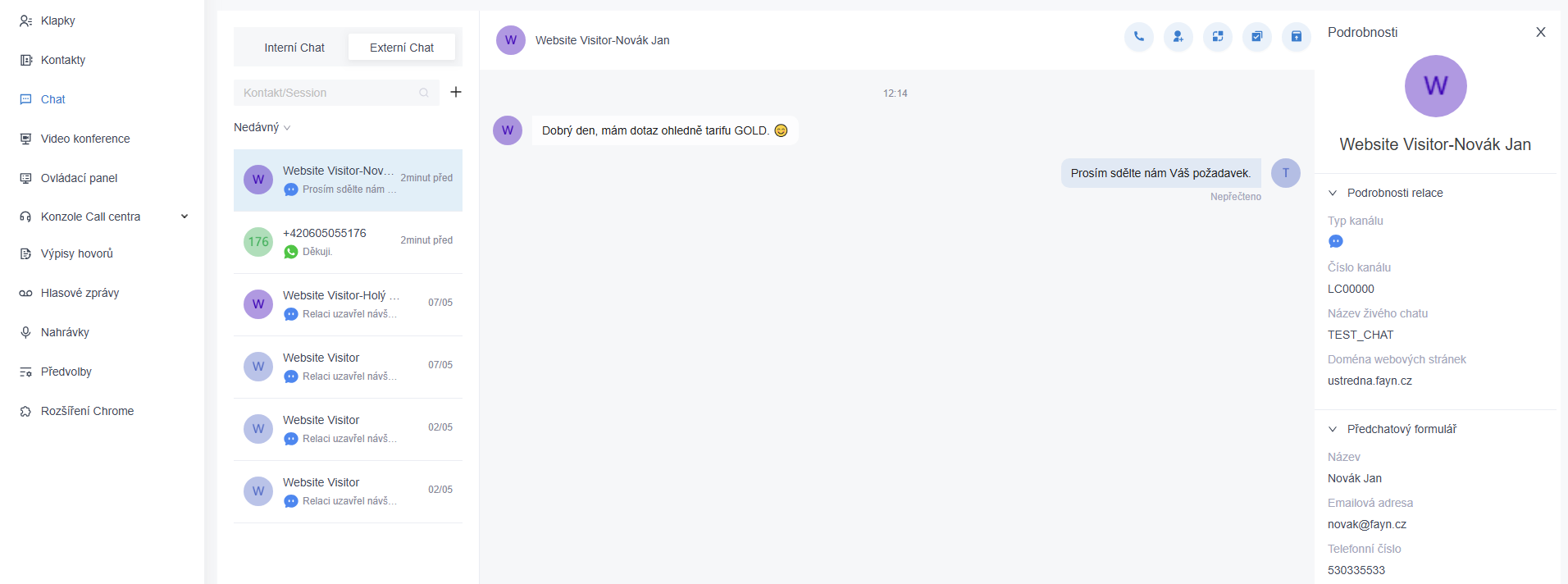 Jakmile zákazník zahájí konverzaci přes tlačítko Live Chat, zobrazí se vám notifikace v aplikaci Linkus, v sekci Chat > Externí chat. Odtud můžete okamžitě vstoupit do chatovací relace a začít komunikovat.