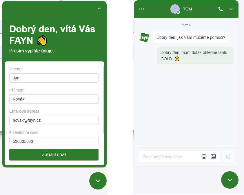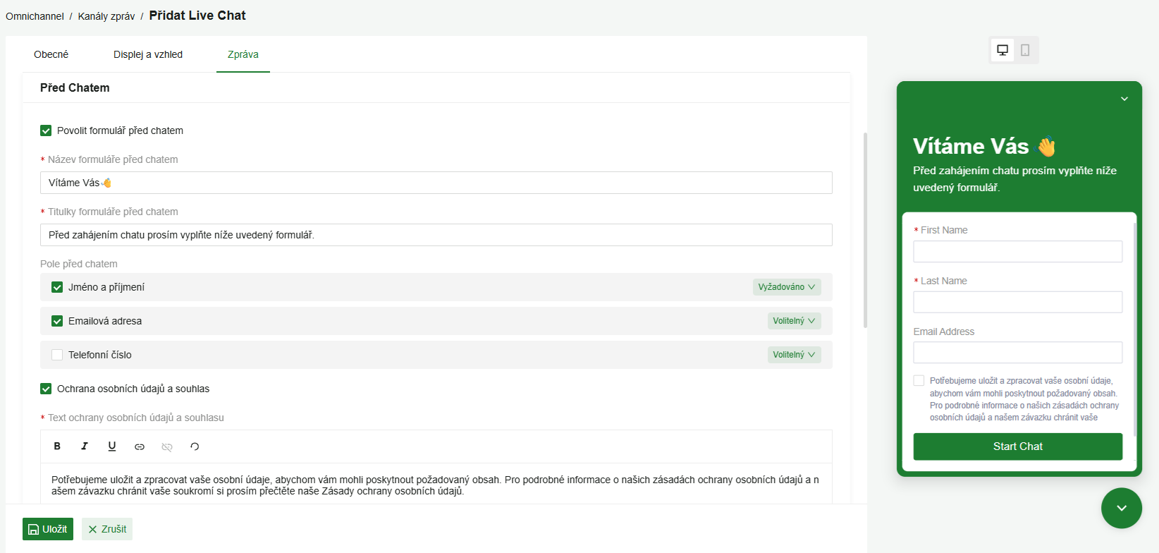 Před zahájením chatu můžete zákazníka požádat o vyplnění jednoduchého formuláře, který vám pomůže lépe identifikovat a kontaktovat tazatele. Formulář může obsahovat následující pole: