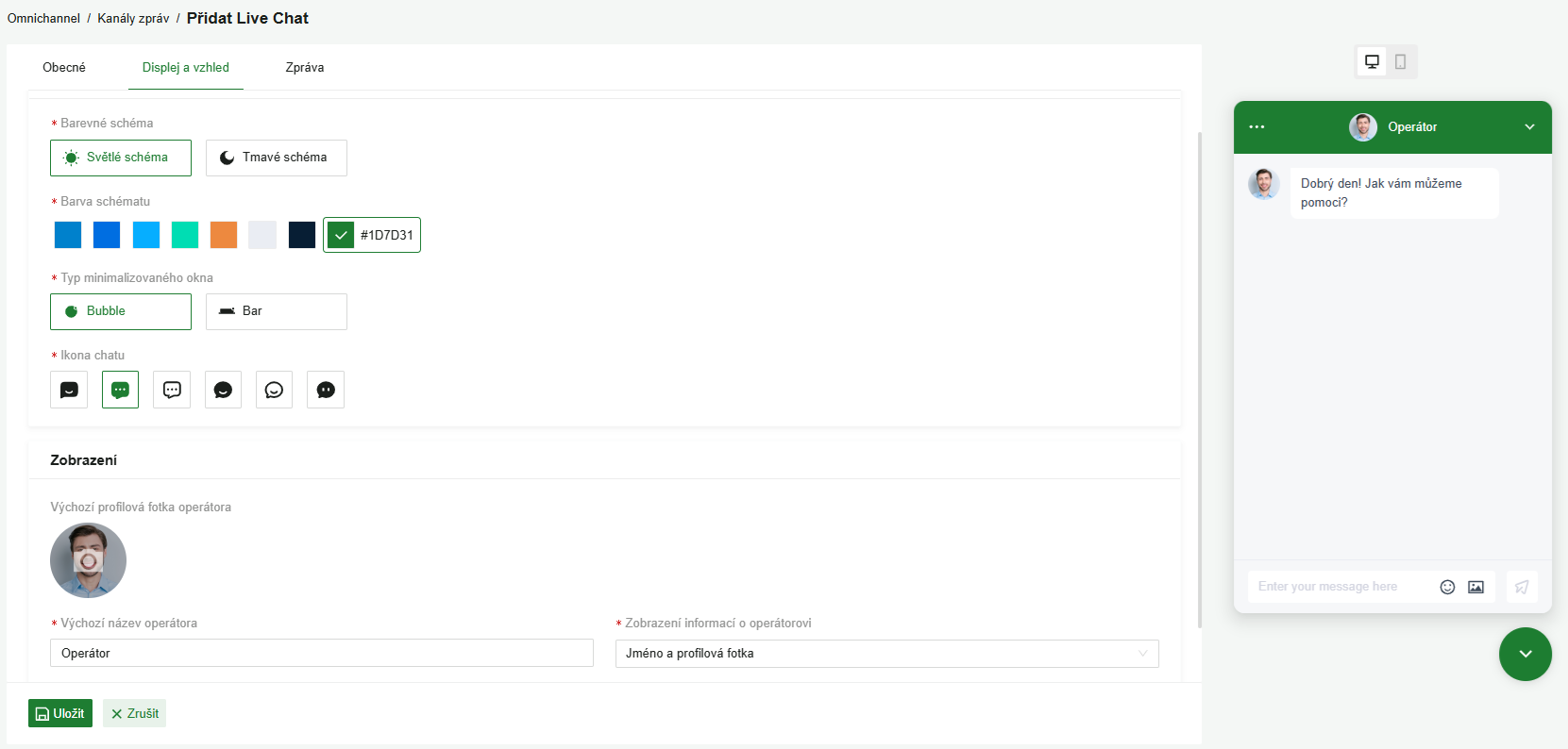 Zobrazení operátora – určete, zda se má v chatu zobrazit profilová fotografie a jméno operátora.