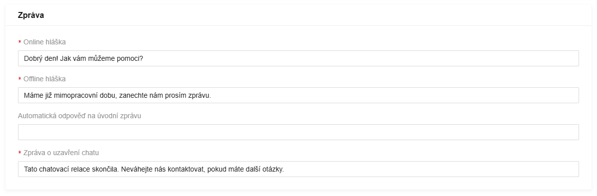 V rámci konfigurace Live Chatu můžete nastavit automatické zprávy, které se zákazníkům zobrazí v různých situacích. Tyto zprávy pomáhají vytvořit profesionální dojem a zlepšit zákaznickou zkušenost.