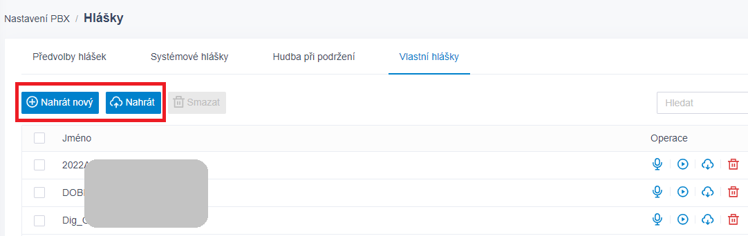 Nahrání nebo vložení vlastních hlášek, které lze poté nastavit do IVR, fronty, hlasové zprávy nebo do předvoleb (obsazení hovoru, přesměrování atd.). Již vytvořené hlasové soubory lze poté přemluvit, přehrát, stáhnout nebo vymazat se systému (automaticky se odstraní i z funkcí, kde je hláška nastavena).