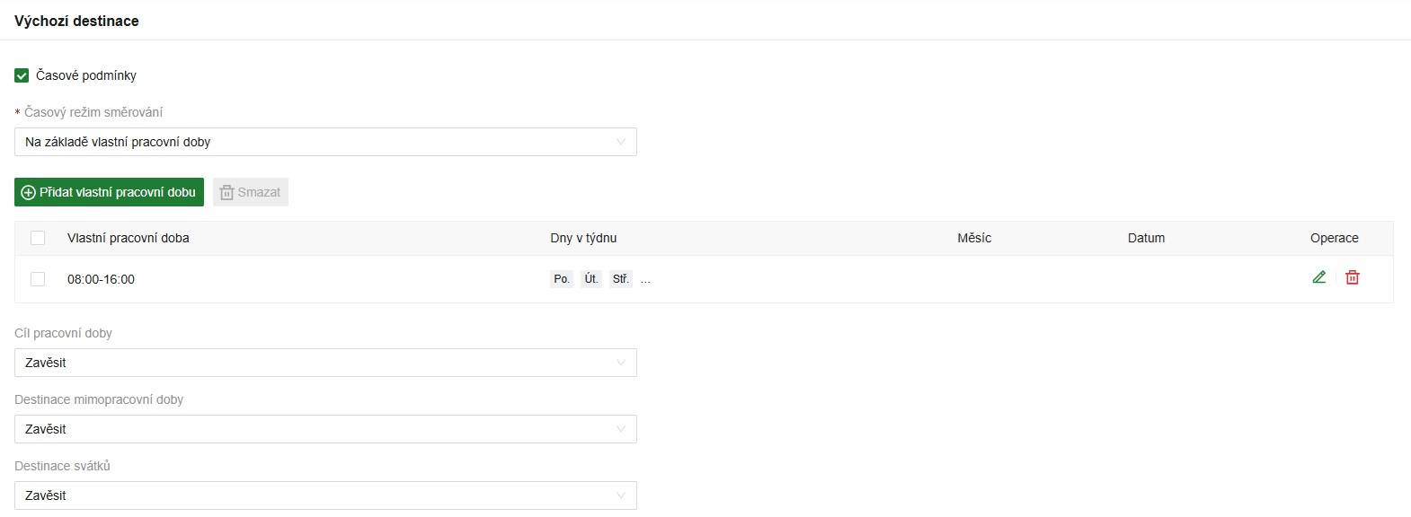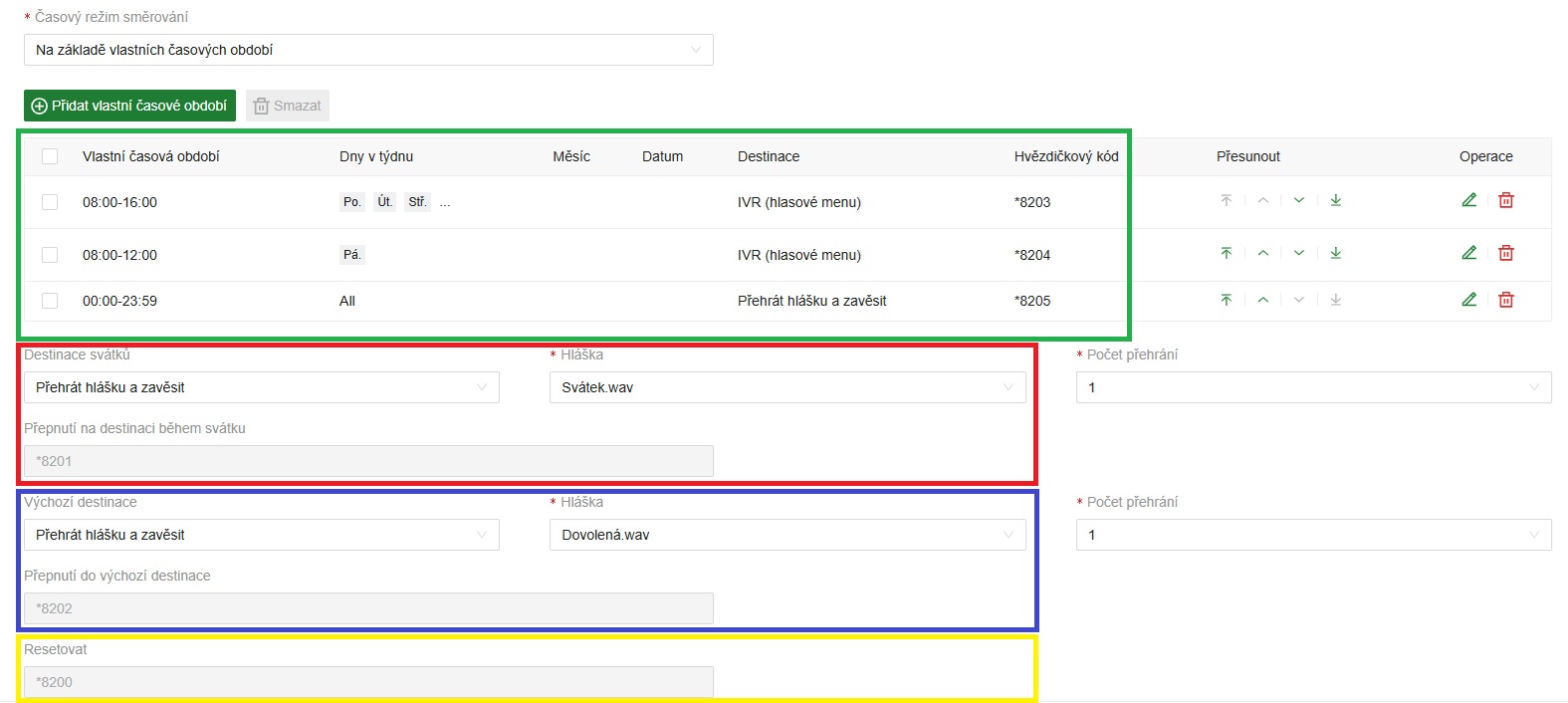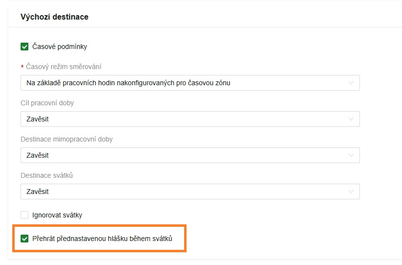 | Mimo pracovní dobu (00:00–23:59, všechny dny) | Přehrát hlášku a ukončit |