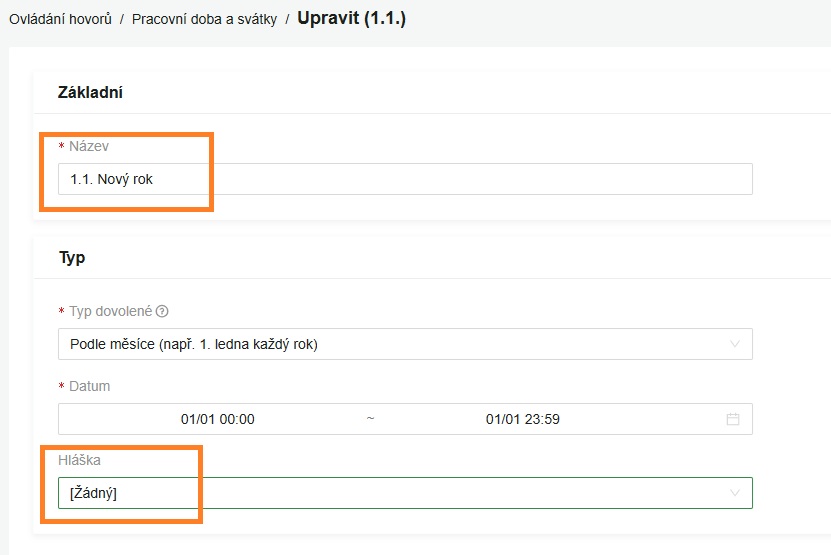 Ke každému svátku lze přiřadit vlastní hlasovou hlášku. Tímto způsobem lze do seznamu svátků zahrnout i firemní dovolené, inventury nebo jiné mimořádné uzávěry. Pokud tuto funkci využíváte, je nutné přiřadit hlášku všem položkám v seznamu svátků a v příchozím pravidle aktivovat volbu „Přehrát prázdninovou hlášku během Prázdnin".