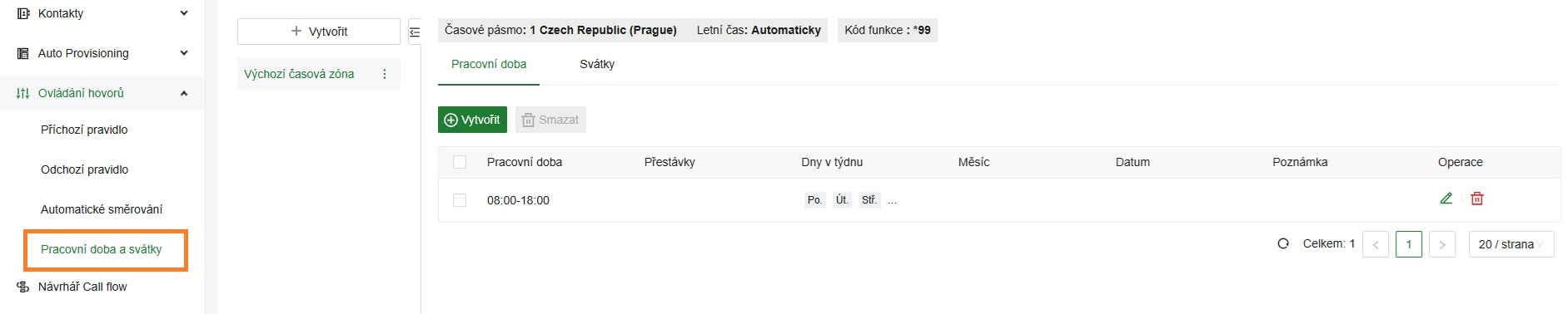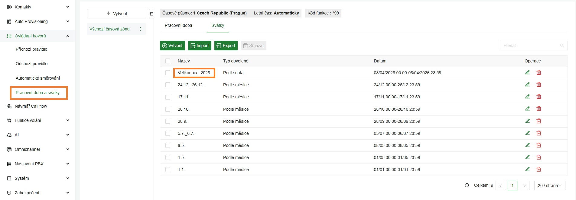 Nastavení naleznete v menu: Ovládání hovorů → Pracovní doba a svátky