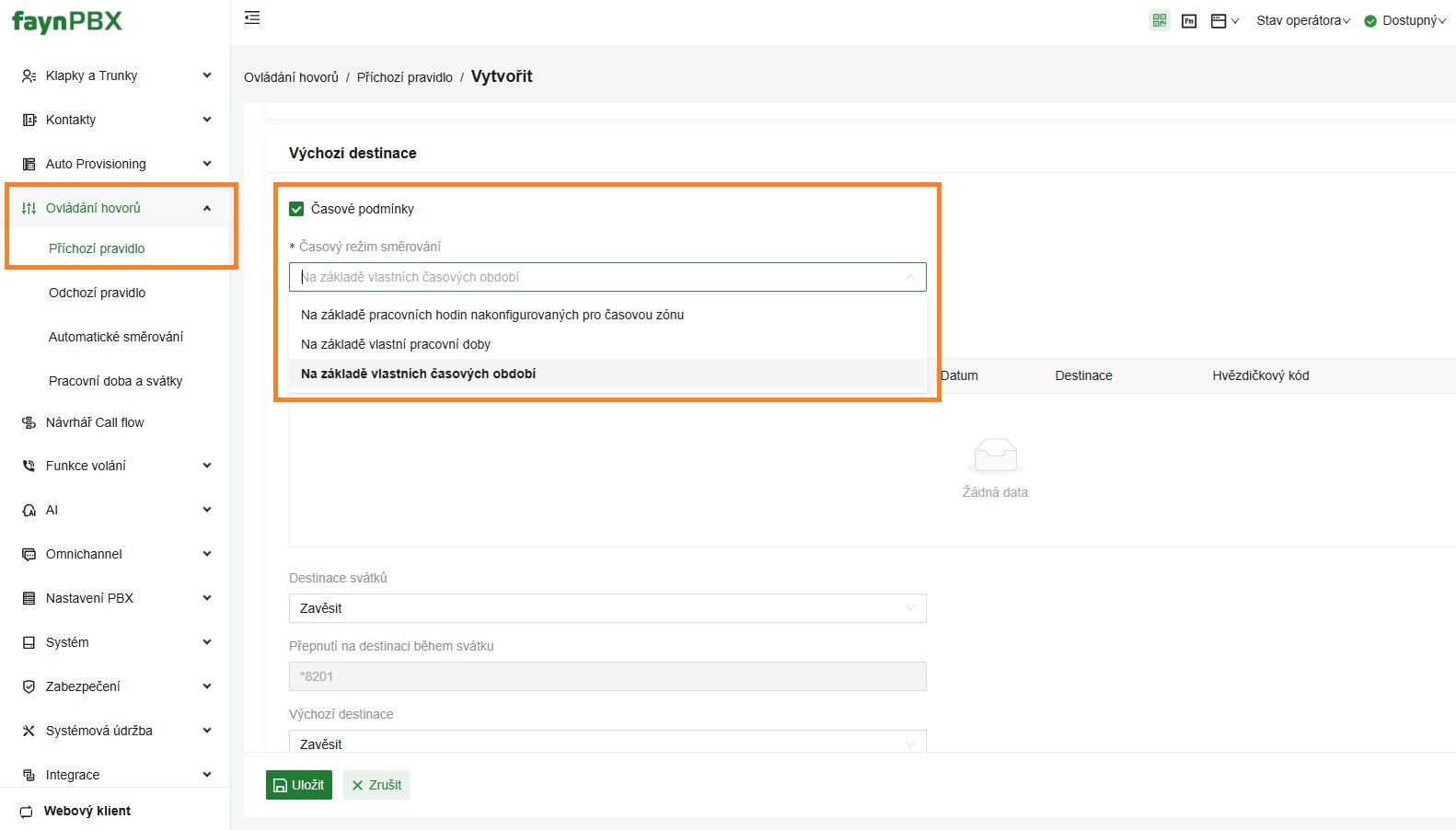 Pro každé příchozí pravidlo v ústředně lze nastavit časové podmínky, které určují, jak budou hovory směrovány v různých časových obdobích – například během pracovní doby, o víkendech, státních svátcích nebo dovolené.