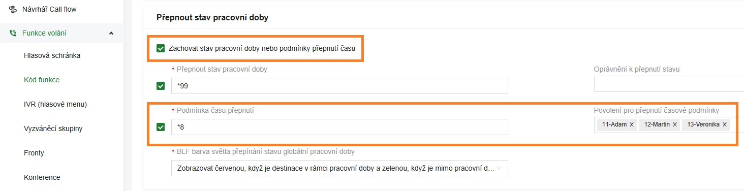 Oprávnění pro správu těchto zkratek se přidělují v menu Funkce volání → Kód funkce.