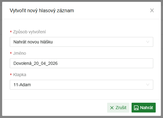 - Vytvořit nový hlasový záznam - Nahrát novou hlášku