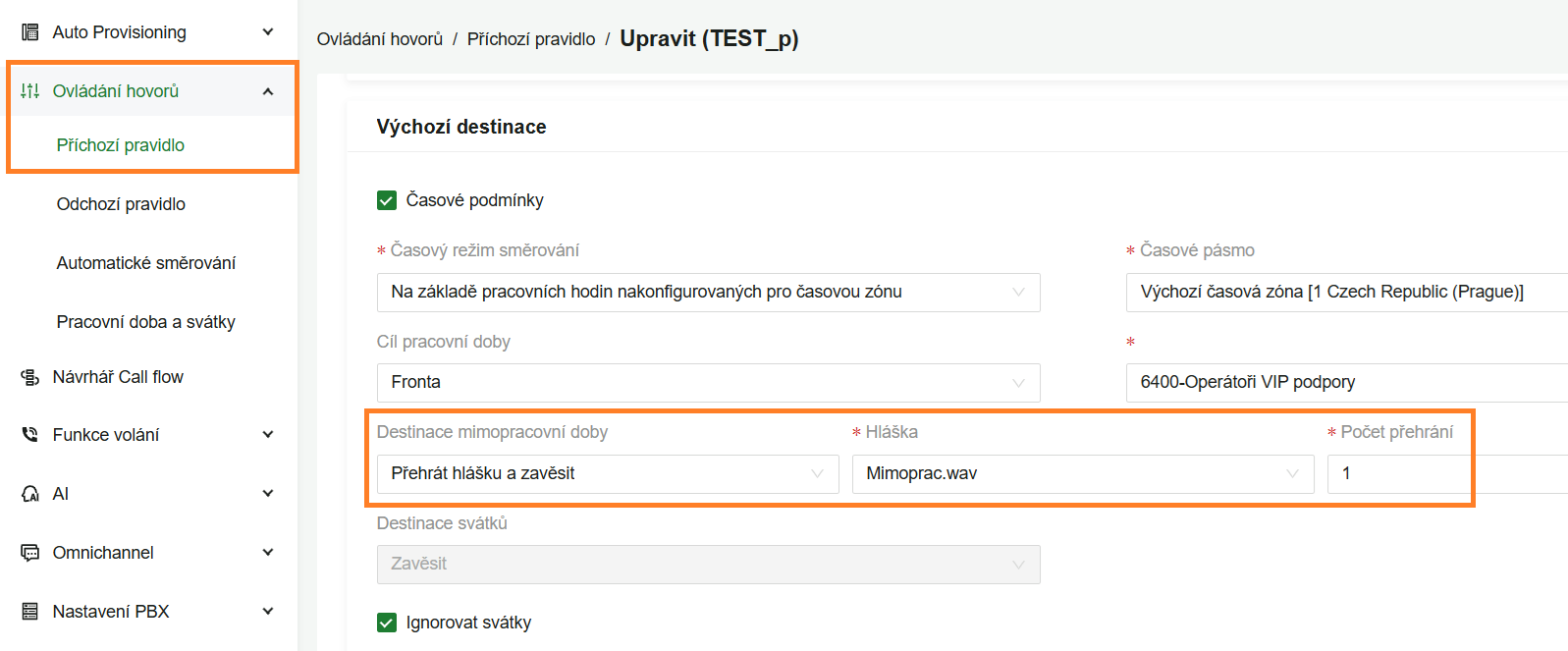 - Příchozí pravidlo – přehrání hlášky a zavěšení hovoru, menu Ovládání hovorů → Příchozí pravidlo