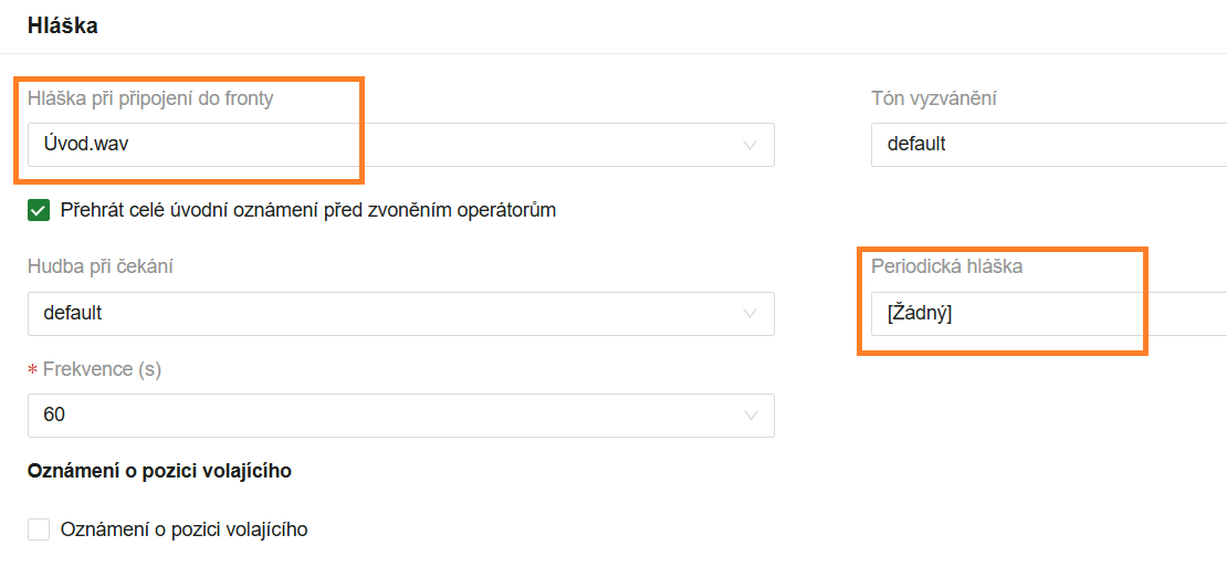 - Volací fronta – úvodní nebo periodická hláška, menu Funkce volání → Fronty