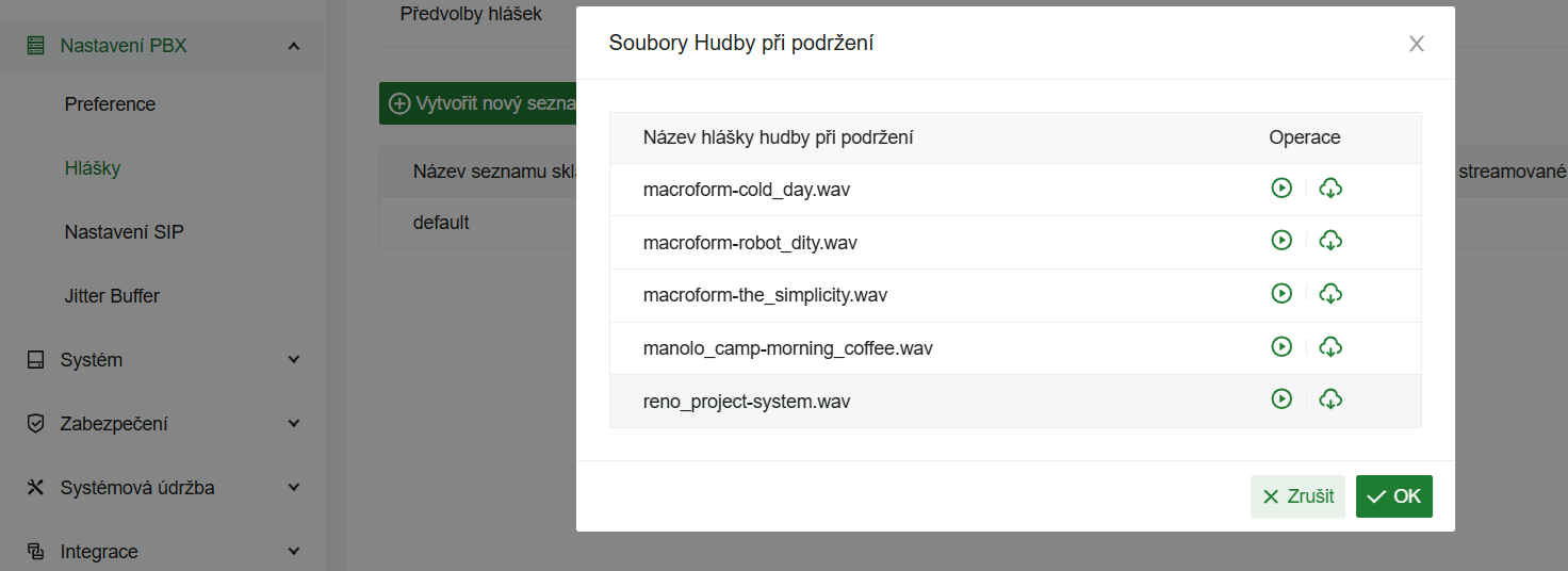 Nastavení naleznete v menu: Nastavení PBX → Hlášky → Hudba při čekání