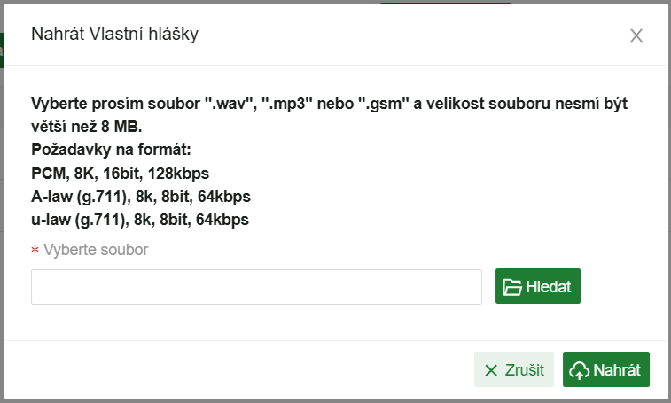 - Pokud máte hlášku již připravenou jako zvukový soubor, lze ji nahrát přímo z počítače. Soubor musí splňovat parametry podporovaného formátu.