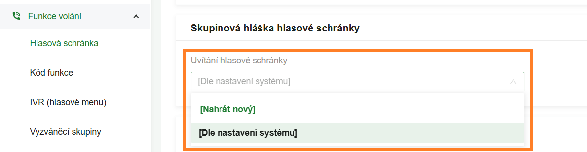 Poznámka ke skupinové hlasové schránce: Pokud nastavujete hlášku pro skupinovou hlasovou schránku, je nutné ji nahrát přímo v menu dané funkce. Postup nahrávání je shodný s ostatními destinacemi.