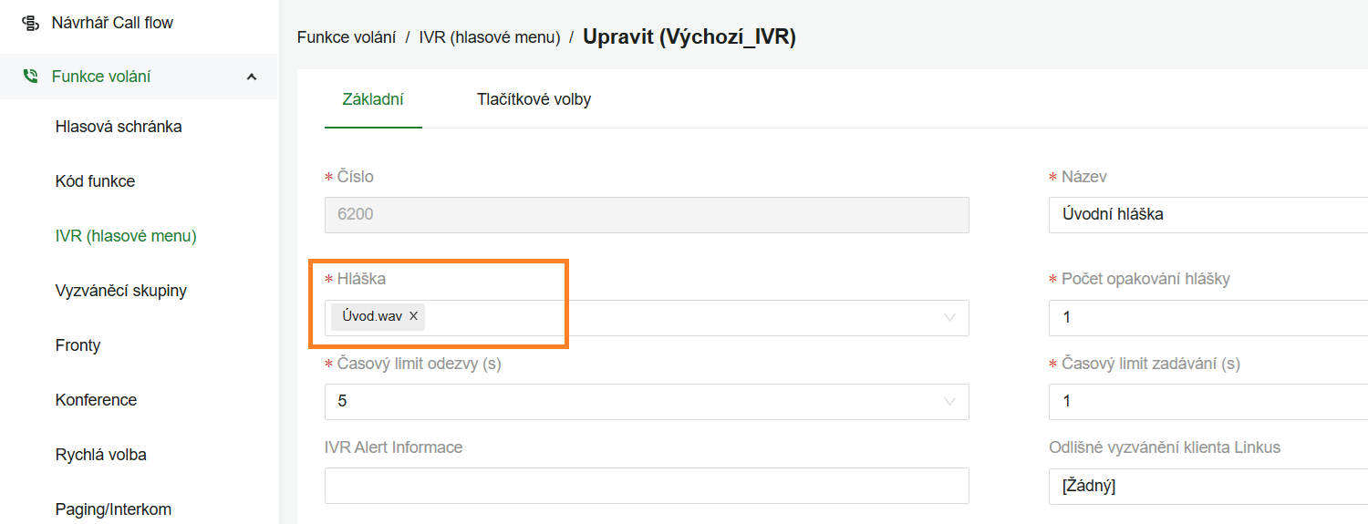 - IVR – menu Funkce volání → IVR (hlasové menu)