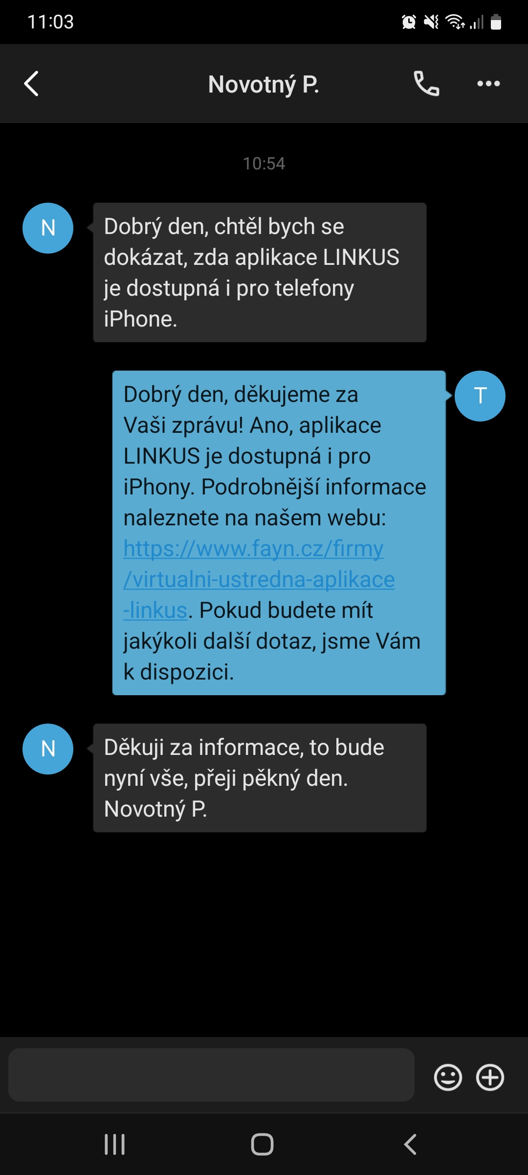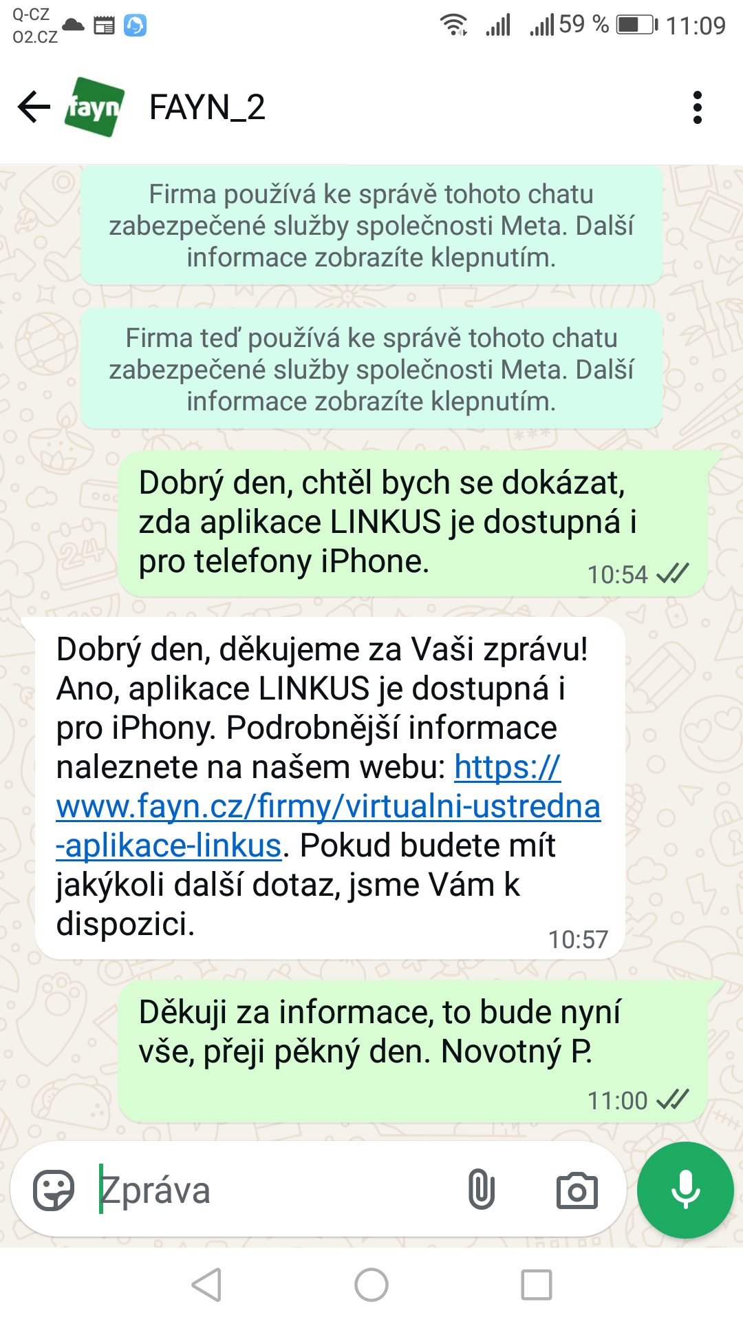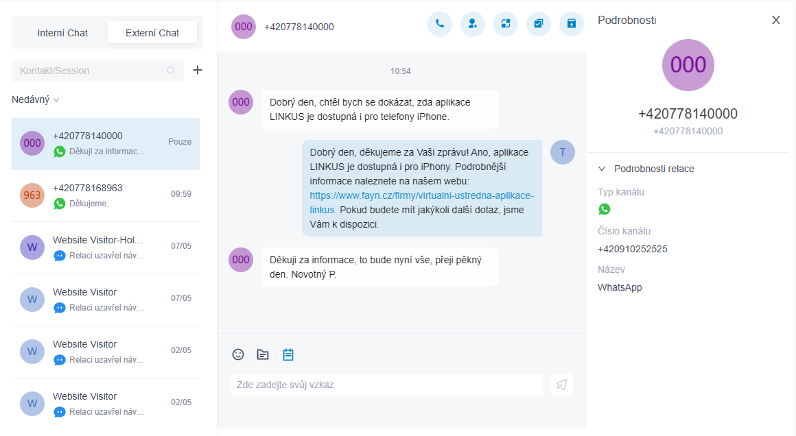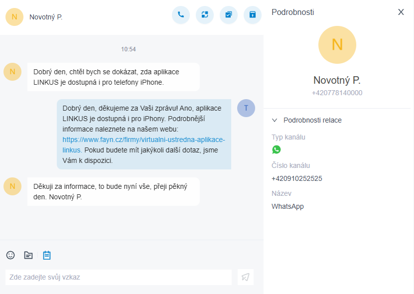 Díky integraci WhatsApp kanálu můžete snadno centralizovat veškerou zákaznickou komunikaci přímo ve své virtuální ústředně. Níže najdete ukázku, jak taková komunikace probíhá.