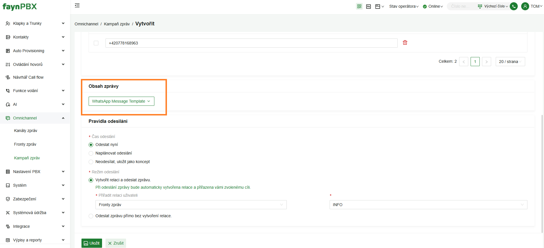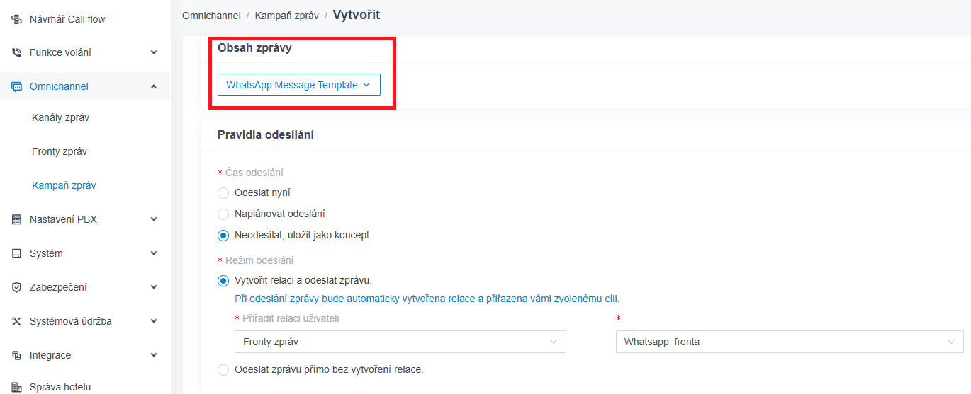 Dále je potřeba zvolit požadovanou šablonu (WhatsApp Message Template), nastavit čas odeslání a určit režim odeslání – tedy zda se má automaticky vytvořit relace, nebo nikoliv.