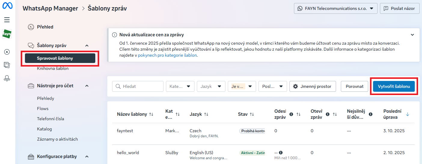 Vytvoření šablony ve WhatsApp Manageru