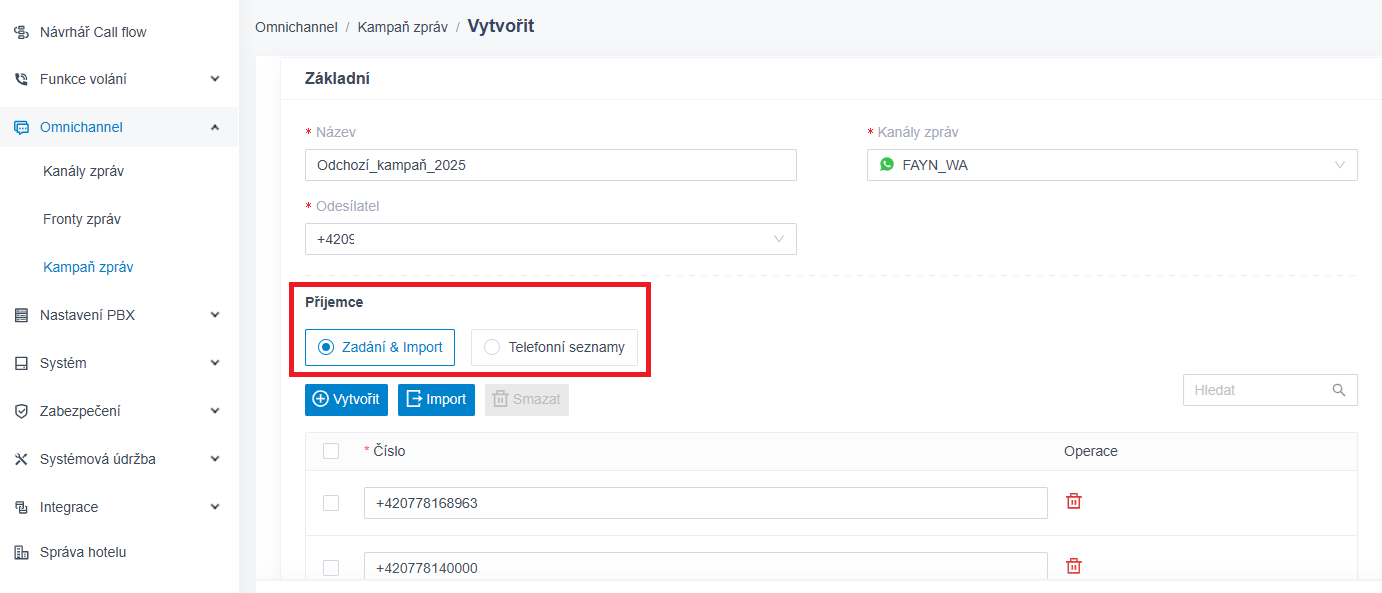Kampaň založíte v menu Omnichannel → Kampaň zpráv. Klikněte na Vytvořit a pojmenujte si kampaň dle potřeby. Poté vyberte: