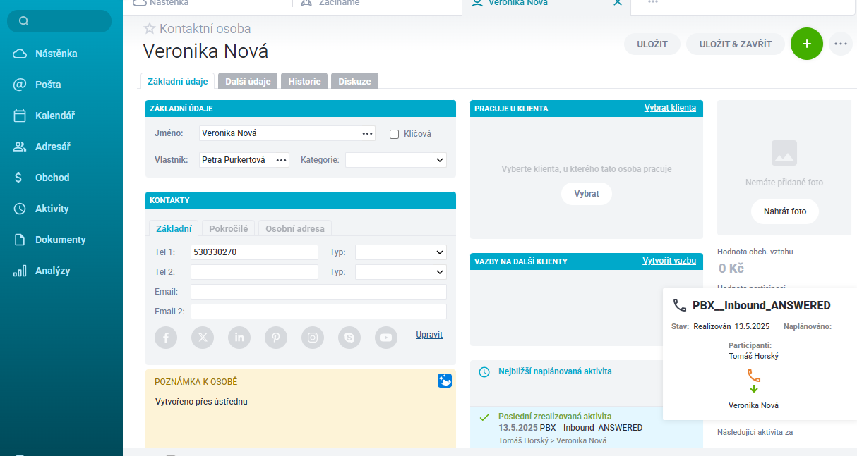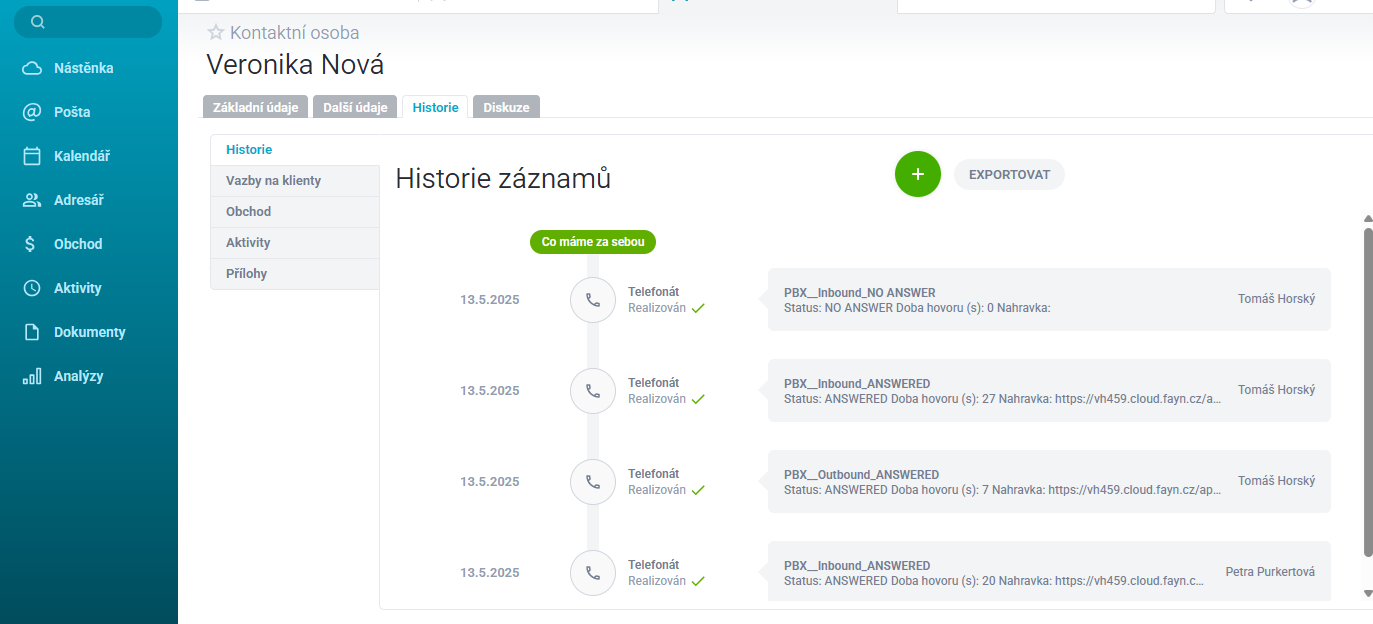 Po ukončení hovoru se do CRM automaticky uloží záznam o hovoru. Záznam naleznete v menu Aktivity → Telefonáty nebo přímo u příslušného kontaktu v záložce Historie.
