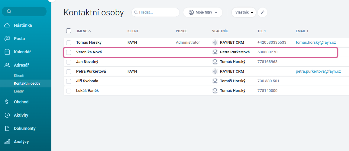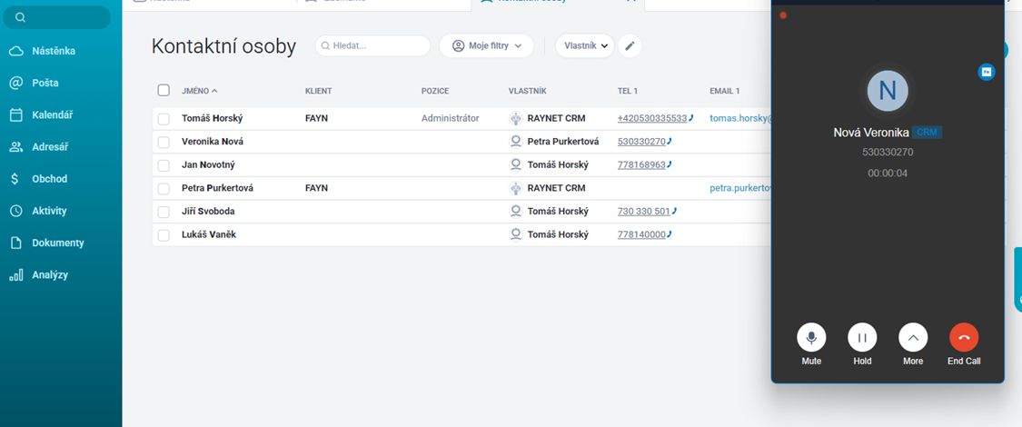 Kontakty uložené v CRM systému RAYNET jsou dostupné v přehledu kontaktů. Při každém hovoru ústředna automaticky ověří, zda volající číslo odpovídá některému z evidovaných kontaktů.