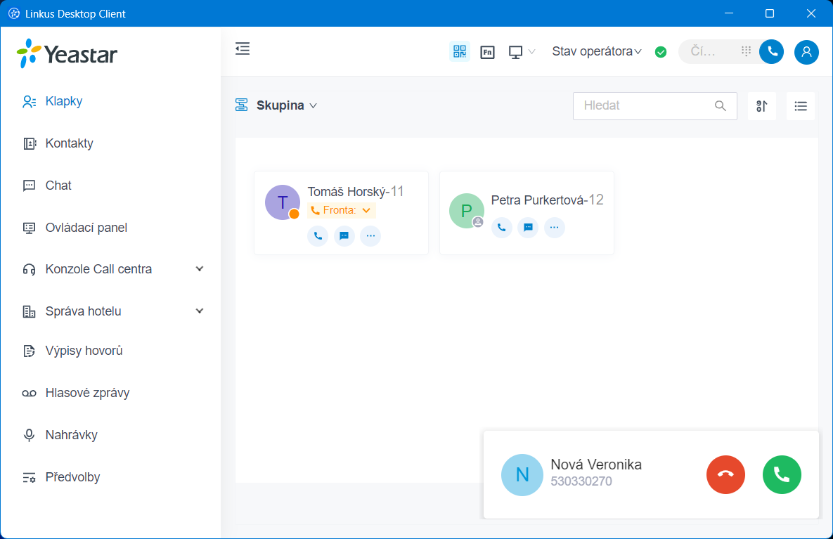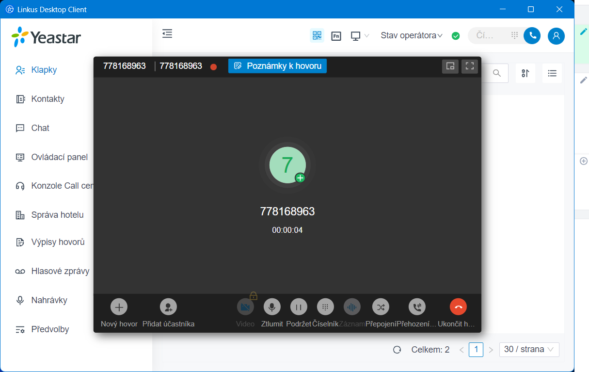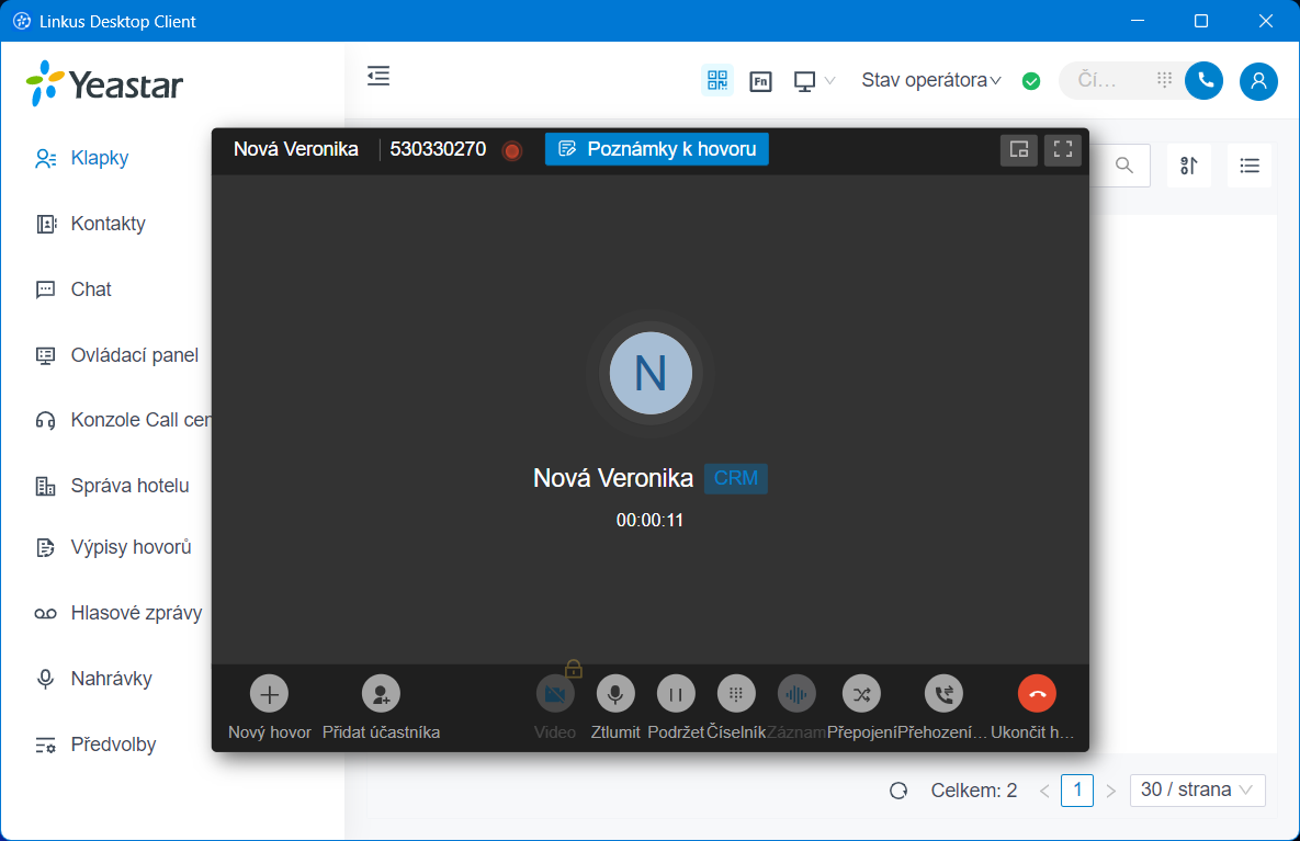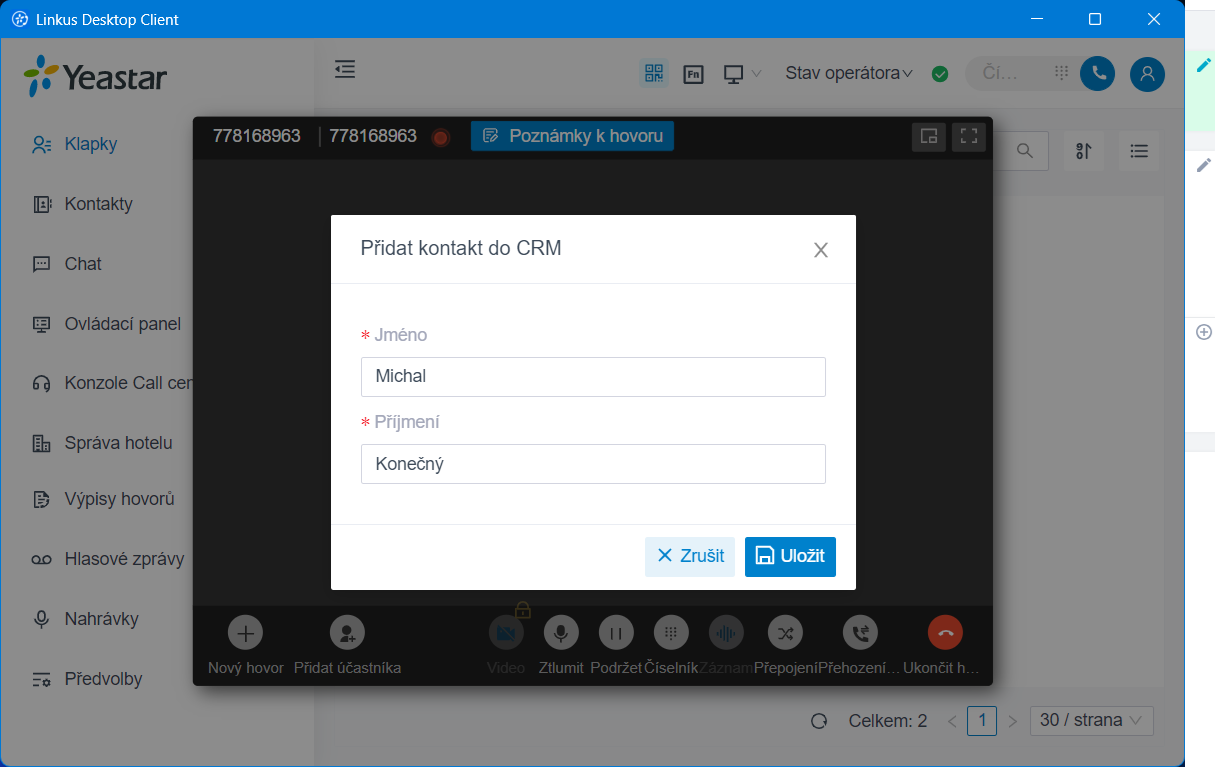 Při příchozím hovoru z čísla, které je již evidováno v CRM, ústředna automaticky provede synchronizaci a zobrazí odpovídající informace o kontaktu přímo v okně hovoru v aplikaci LINKUS.
