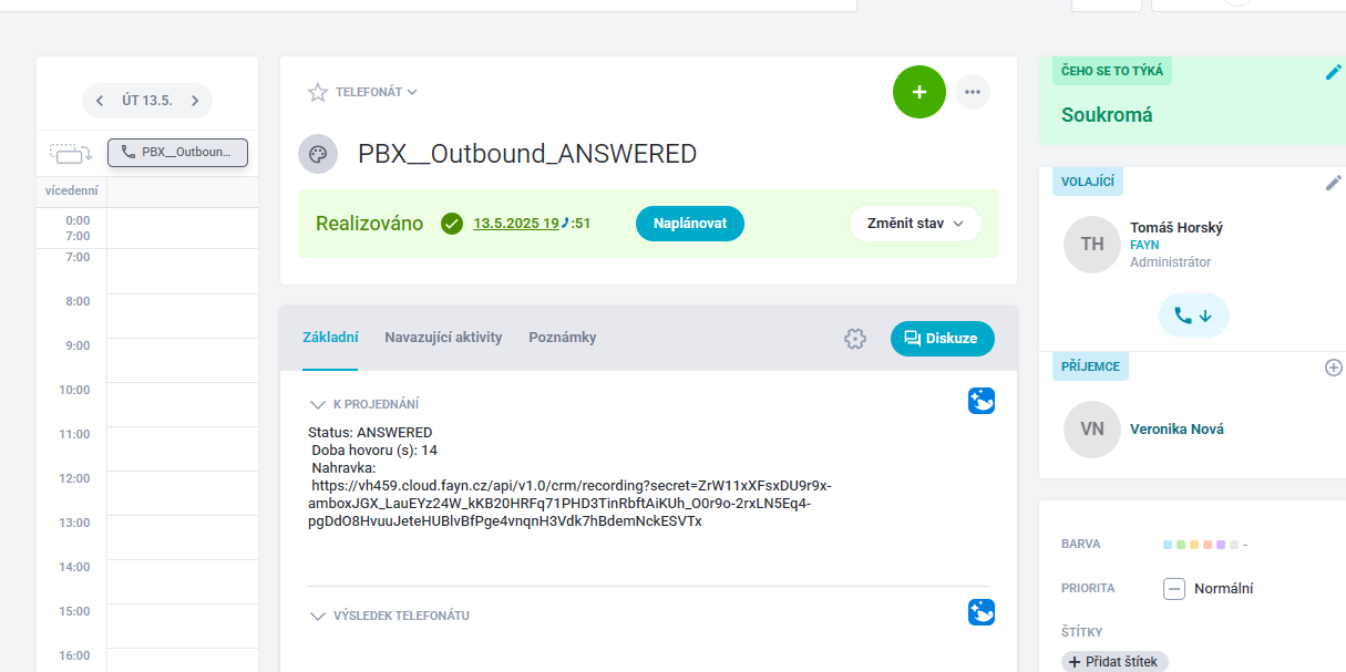 Každý záznam lze rozbalit pro zobrazení podrobností – délky hovoru, směru, propojeného uživatele a kontaktu. Je-li hovor nahráván a nahrávka je dostupná na ústředně, zobrazí se přímý odkaz pro její přehrání přímo v CRM. Zaznamenávají se příchozí i odchozí hovory.