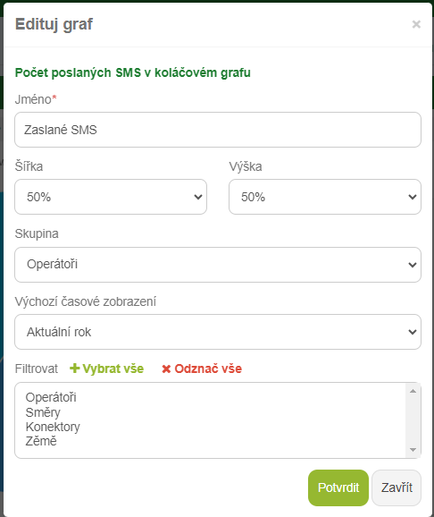 Každý přidaný graf lze upravovat – změnit jeho název, šířku a výšku v dashboardu, skupinu operátorů, časové zobrazení a vybrat filtry.