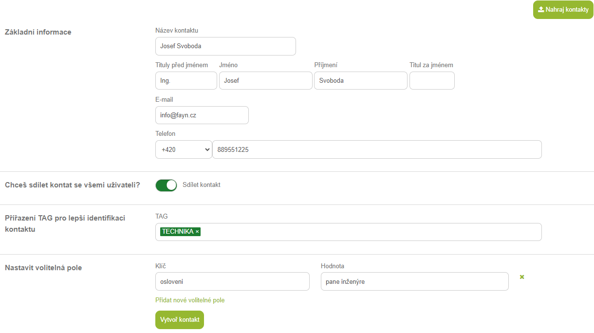 Pro vytvoření kontaktu, klikněte na tlačítko Vytvořit. Každý kontakt musí mít název a zadané číslo.