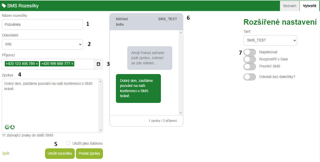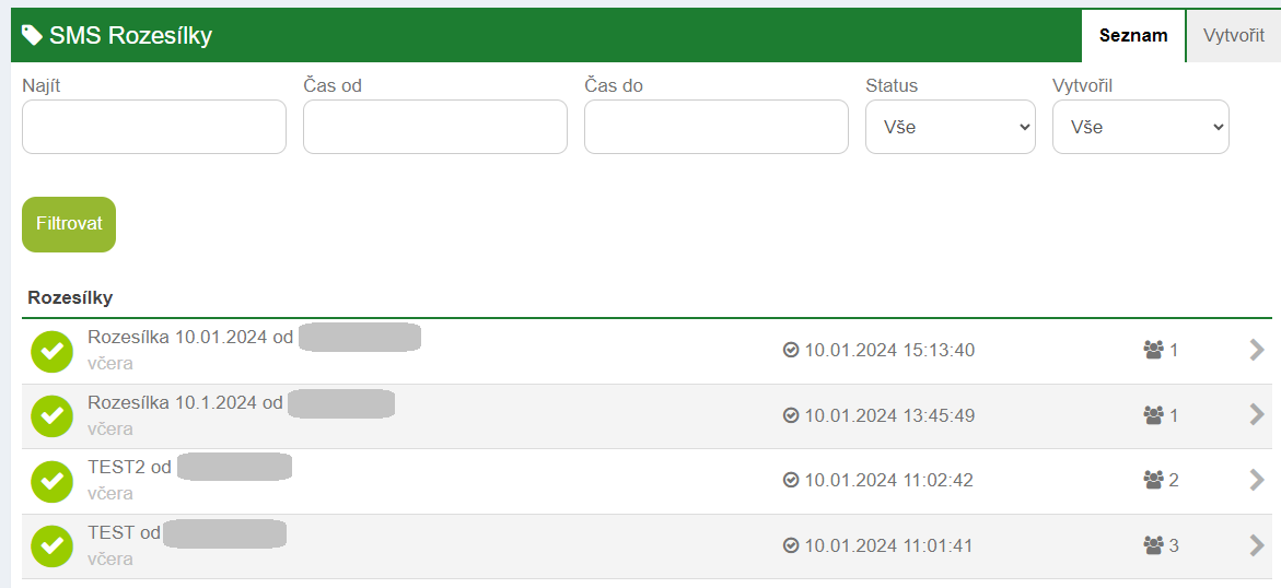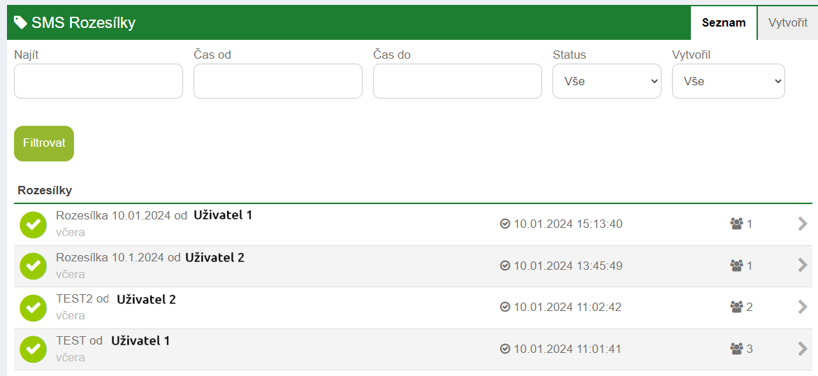 Sekce SMS rozesílky slouží k odesílání SMS zpráv a jejich plánování. Je rozdělena do dvou částí: Seznam a Vytvořit.