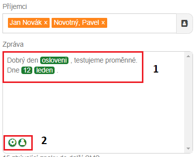 Zpráva – pole pro text SMS s možností použití proměnných.