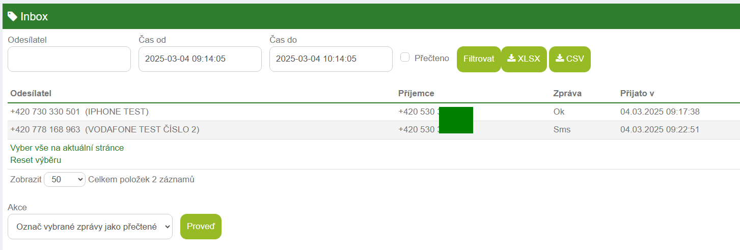 V sekci Inbox najdete všechny příchozí SMS zprávy (pokud je tato funkce aktivována).