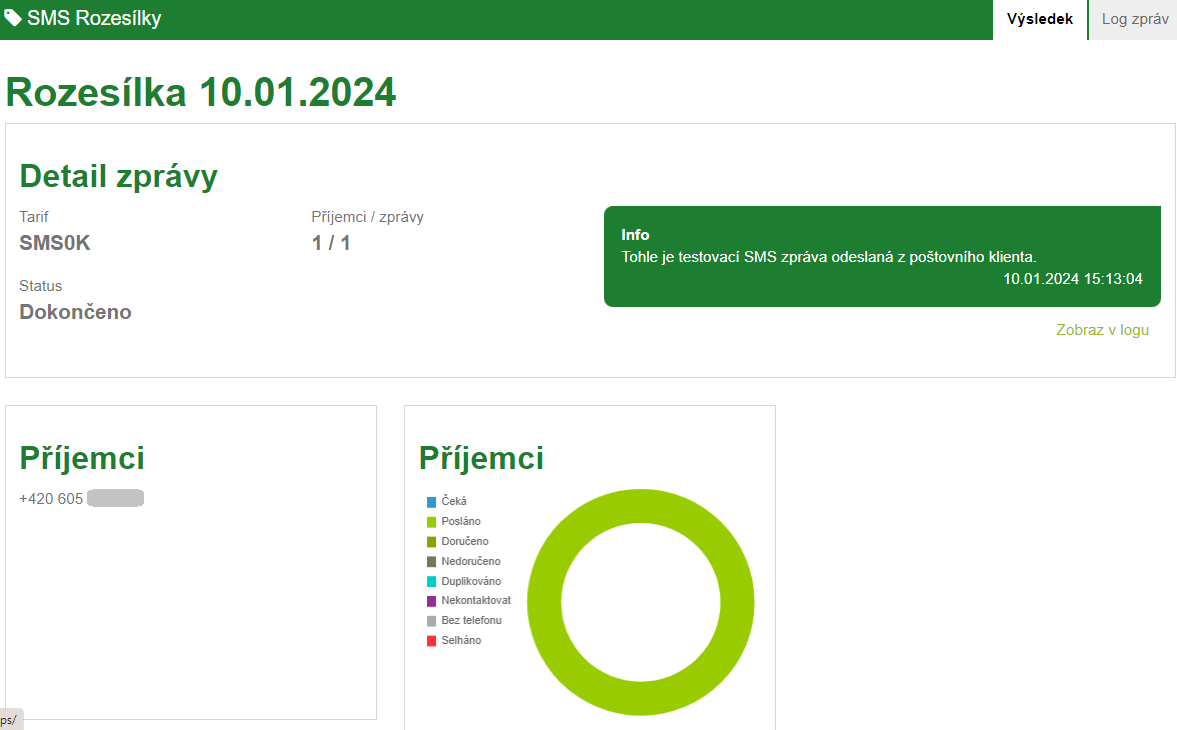Náhled odeslané SMS zprávy ze dne 10.01.2024 (první řádek):