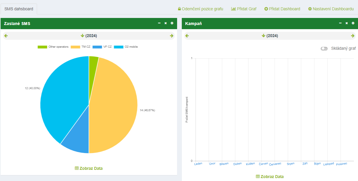 Sekce Dashboard umožňuje vytvářet vlastní přehledy. Do dashboardu můžete přidat grafy odeslaných SMS (sloupcový nebo koláčový graf) a také widget zobrazující počet SMS kampaní.